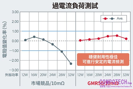 GMR50具有出色的散熱性能,與普通產品相比對過電流負載的耐久性更為優異,即使流過超過額定值的過電流,其電阻值的變化也很小,所以可以保持穩定的電流檢測精度。