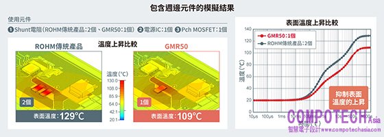 除了分流電阻,ROHM 還擁有從 IC 到各種功率元件等豐富產品系列,並強化獨有的熱模擬等設計支援。例如,此次研發的 GMR50,就能夠與 ROHM 傳統產品的表面溫度上升進行模擬比較。經確認後,以前需要並聯使用2個傳統產品(5025尺寸)的電路,即使減少成只使用1個GMR 系列產品,也能夠抑制產品的表面溫度上升。