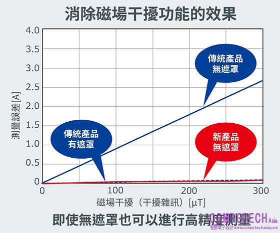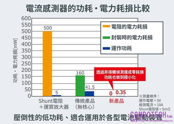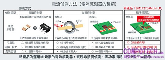傳統採用霍爾元件的產品,如果不在電流感測器內佈設電流線,就無法檢測電流,而佈線則會產生損耗、發熱問題,萬一電流感測器損壞,可能會導致整個系統停擺。而ROHM新產品利用MI元件的高靈敏度特性,能以非接觸方式檢測電流,即使在高電壓的應用裝置中,也不會發生額外的損耗和發熱問題,且無需絕緣,設計上更為簡潔,有助於提高系統可靠性。