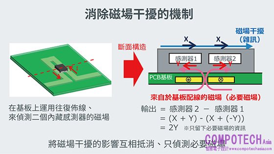 傳統產品會受地磁等干擾影響而產生測量誤差,需要採用磁遮罩措施來摒除干擾。而ROHM新產品安裝在PCB板的來回佈線上,利用內部的雙感應單元即可消除干擾磁場的雜訊,僅會檢測到原本需要測量的電流磁場,因此無需遮罩即可進行高精度測量。
