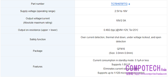 東芝最新的[2] DMOS製程確保TC78H670FTG具有卓越的品質與低導通電阻。該製程還有助於這款IC實現超低待機電流。此IC採用QFN16超小封裝,並透過整合電流檢測電阻來減少外部零件的使用,從而降低成本,精簡電路,節省PCB板佈線空間。