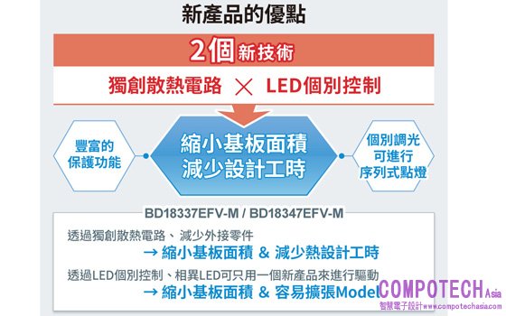 新產品採用了兩項新技術:「熱分散電路」和「LED個別控制功能」,有助於大幅削減LED燈電路板面積和應用設計週期。