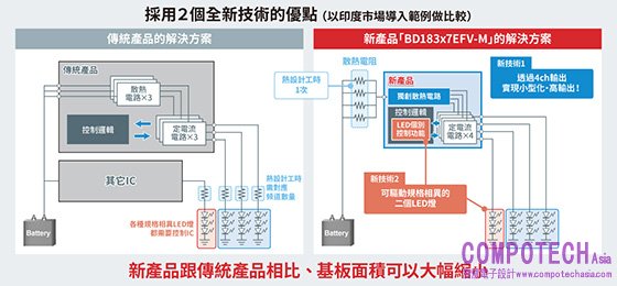 新產品採用了ROHM獨創熱分散電路和LED個別控制功能等兩項新技術,有助顯著減少LED燈的電路板面積和應用設計週期,將可成為以印度為主的海外二輪機車市場的最佳解決方案。