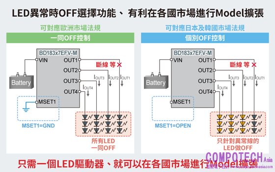 新產品內建控制方式選擇功能,當LED發生異常時,可選擇所有通道斷路或單通道斷路。例如,當一路尾燈因斷線等原因不亮時,可選擇切斷其他所有通道或僅切斷有發生斷線的通道。各國在對於二輪機車牌照燈發生異常時的安全標準不同,新產品可透過一種設定對應眾多國家和地區的法律,因此在各國進行機型拓展時,可減少重新設計的工時。