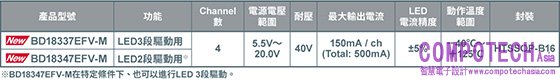 LEDdriverIC_C-1半導體製造商ROHM(總公司:日本京都市)針對日益普及的二輪/四輪車用LED尾燈(刹車燈、後尾燈)、霧燈、轉向燈等,研發出內建MOSFET的4通道線性LED驅動IC「BD183x7EFV-M」(BD18337EFV-M / BD18347EFV-M)。