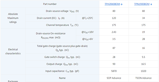 新產品為兩款封裝,一款為採用表面黏著SOP Advance封裝的TPH2R408QM以及TSON Advance封裝的TPN19008QM。即日起出貨。