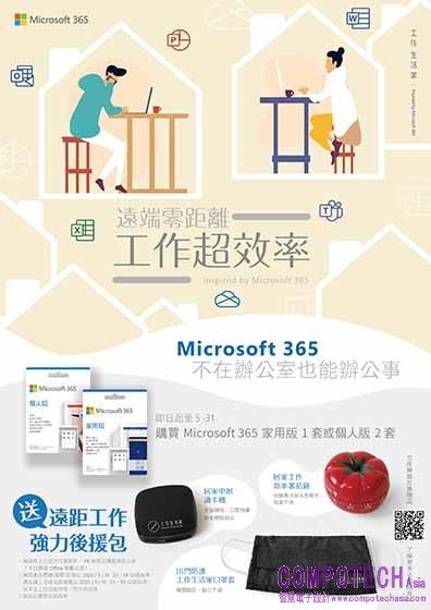 為慶祝新品上市與支持遠距工作的消費者,即日起購買Microsoft 365個人版兩套或是Microsoft 365家用版一套,即可獲贈「遠距工作強力後援包」,限時贈送至5月31日止。贈品包含: