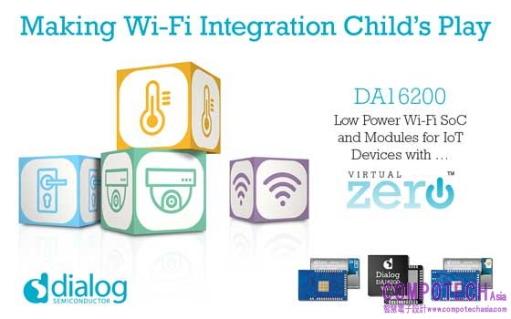 2020年5月11日--英商戴樂格半導體(Dialog Semiconductor,法蘭克福證券交易所代號: DLG)為電池管理、AC/DC電源轉換、Wi-Fi、BLE(藍牙低功耗)、以及工業IC的領先供應商。今日宣布推出高度整合的超低功耗Wi-Fi連網SoC ─ DA16200,以及兩個運用Dialog VirtualZero技術為Wi-Fi連網,電池供電的IoT設備實現電池壽命突破的模組 。