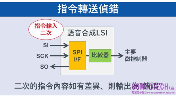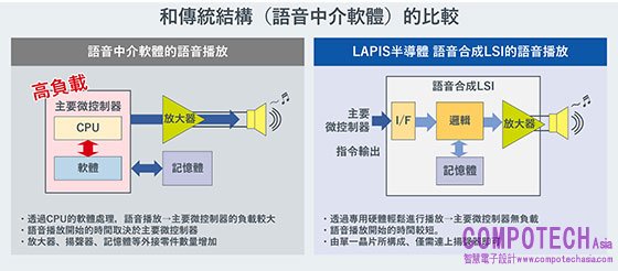 LAPIS半導體的語音合成LSI中內建通訊介面、邏輯、記憶體、放大器,構建出不需依賴主控MCU的語音輸出系統,並可減少軟體設計工時,因而在車電領域的應用越來越廣泛。