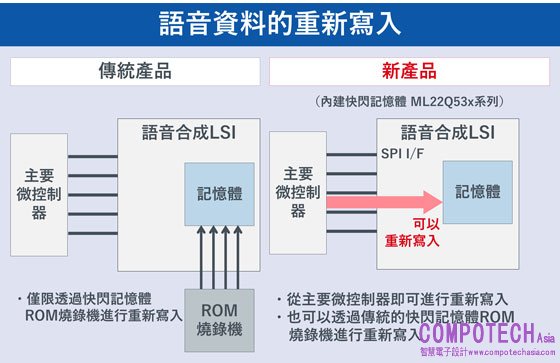 以傳統ROM燒錄機進行的On-Board重新寫入功能為基礎,新增了透過主控MCU執行的重新寫入功能。可以利用主控MCU經由SPI I/F將資料寫入內建FLASH記憶體(ML22Q53x系列)或外接FLASH記憶體(ML22530系列),不僅可以在研發過程中重新寫入語音資料,還可以在產品出廠後重新寫入語音資料。該功能也可支援未來與互聯網連接、對應新世代汽車的IoT相關需求。