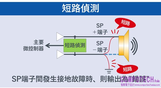 新產品支援車電產品所要求的高溫工作(105℃),並符合汽車電子產品可靠性標準「AEC-Q100※1」。此外,還搭載了傳統機型中也搭載的短路檢測、高溫異常檢測、指令傳輸錯誤檢測等異常檢測功能,非常有助於增加車電語音輸出系統的可靠性。