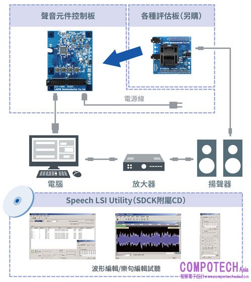 LAPIS半導體還提供研發工具「SDCK3」,支援從創建語音資料到創建/寫入/試聽語音合成LSI的ROM資料等一系列操作。另外,若結合SDCK3和另售的參考板,便能同時進行將硬體及軟體一起評估。