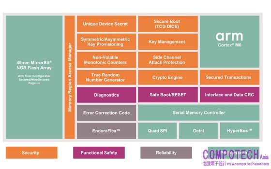 Semper Secure NOR 快閃記憶體系列包括通過 AEC-Q100 車用認證裝置,支援 -40°C 至 125°C 的寬廣工作溫度以及1.8V 至 3.0V 操作電壓,並提供 128 MB、256 MB 及 512 MB 三種規格。Semper Secure NOR 快閃記憶體完全符合 ISO 26262 標準及 ASIL-B 等級,並可用於最高至 ASIL-D等級的系統。其採用的 EnduraFlex™ 架構可實現高耐性或長時間資料保存分區的最佳化,從而簡化系統設計。Semper Secure NOR 快閃記憶體提供 Quad Serial Perpheral Interface (SPI)、Octal SPI 和 HyperBus™ 介面。其中 Octal 和 HyperBus 介面符合針對高速 x8 系列 NOR 快閃記憶體的 JEDEC eXpanded SPI (xSPI) 標準,並提供高達 400 Mbps 的讀取頻寬。