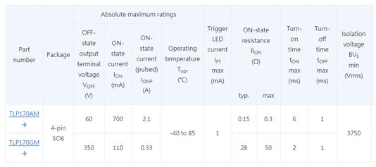 TLP170AM的斷態輸出端額定電壓為60V,恒定導通電流(ION)為0.7A,脈衝狀態工作時最高可達2.1A。TLP170GM為350V版本,ION恒定電流為110mA,脈衝狀態工作時為330mA。