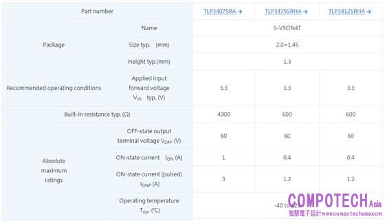 東芝電子元件及儲存裝置株式會社(東芝)推出三款光繼電器“TLP3407SRA” 、“TLP3475SRHA”和“TLP3412SRHA”。它們是業界尺寸最小的[1]電壓驅動光繼電器,額定工作溫度範圍提高至125℃。