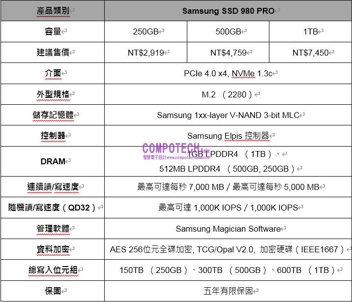 2020年10月5日--全球先進記憶儲存技術領導品牌三星電子,發表旗下首款消費級 PCIe 4.0 NVMe固態硬碟(SSD)-Samsung SSD 980 PRO,目標族群鎖定渴望在高階PC、工作站與遊戲表現皆能發揮頂尖效能的專業人士和消費者。980 PRO共將推出250GB 、500GB、1TB多元容量選擇,建議售價分別為NT$2,919、NT$4,759以及NT$7,450,即日起於三星商城、PChome 24h購物、momo購物網、Yahoo奇摩購物中心全台指定通路上市。詳情請造訪:https://www.samsung.com/tw/ssd/。