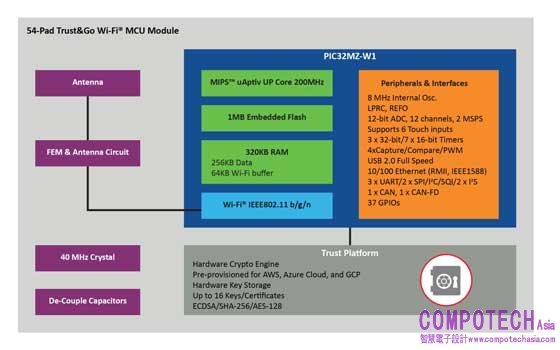 與現有設備不同,Microchip的新技術包括頂尖的PIC32 微控制器核心、豐富的周邊支援和成熟的硬體安全平臺。新技術不僅能提供Wi-Fi,還能充當整個工業互聯網系統的強大微控制器核心。