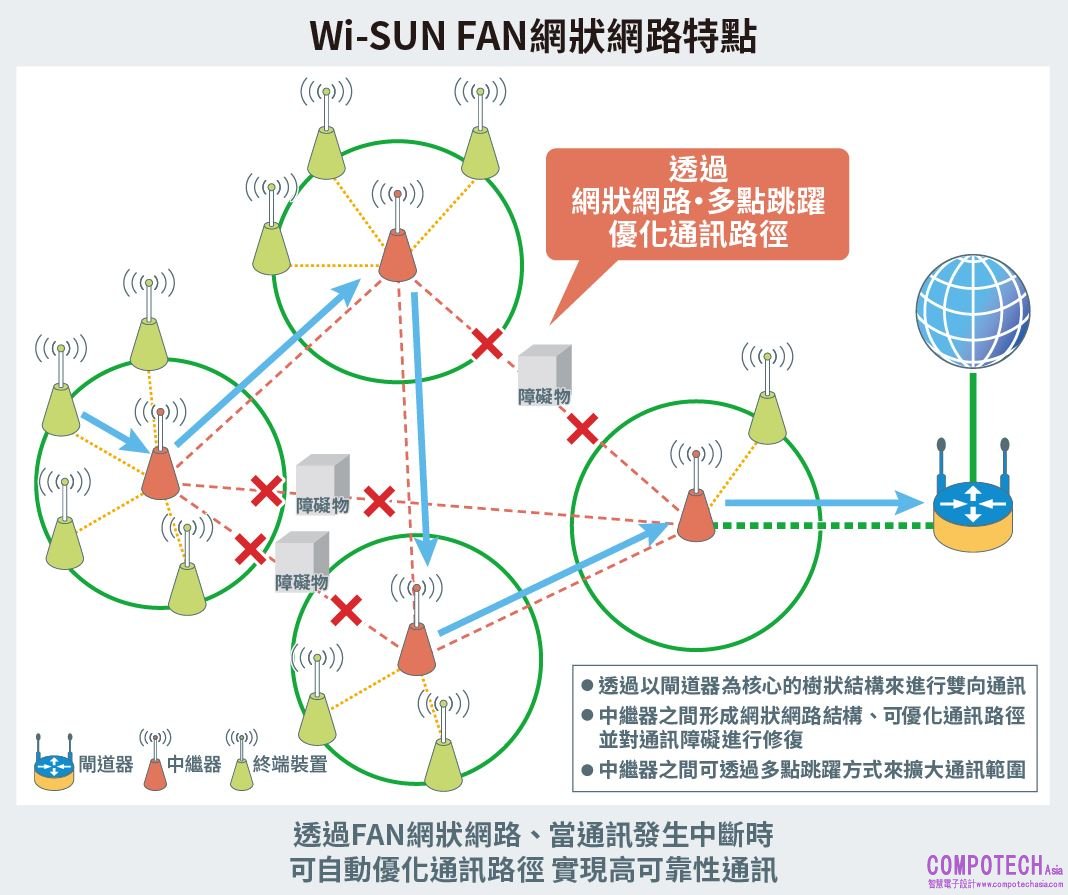 Wi-SUN FAN(Field Area Network)是國際無線通訊標準「Wi-SUN」的最新規格,與其他類的LPWA*1技術相比,不但無需通訊成本,且能透過多躍式(multi-hop)網路,自動依據實際無線電波情況切換連接目標,達成可靠性更高的特點。有望在智慧城市和智慧電網*2的發展中,成為建構其所需的大規模網狀網路的通訊技術。