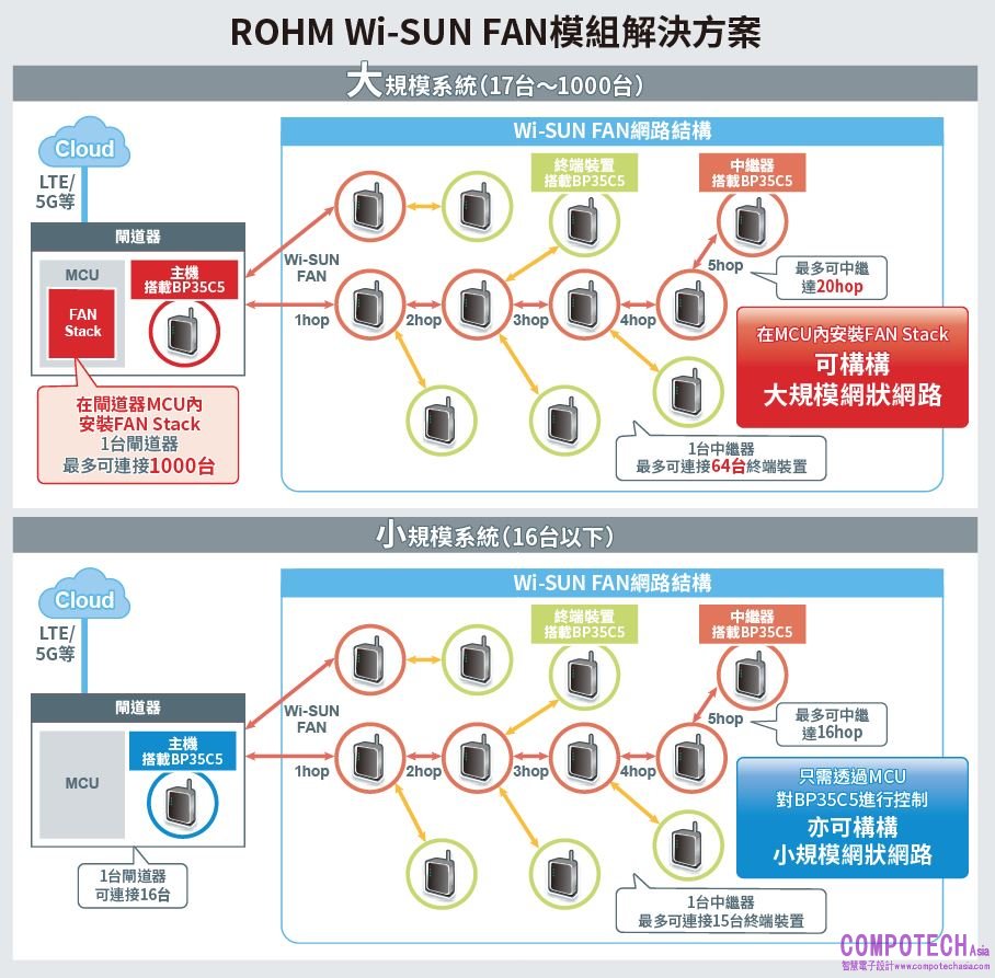 本次解決方案使用ROHM研發的超小型(15.0mm × 19.0mm)、且支援Wi-SUN FAN的無線通訊模組「BP35C5」所配置而成。建構大規模網路時,在主機閘道器MCU內建立具有Wi-SUN FAN的Protocol Stack(FAN Stack)連接通訊模組「BP35C5」,中繼器之間最多可擁有20個躍點,每個中繼器最多可連接64個終端裝置,因此能同時連接多達1000個裝置。若將其使用在智慧電表、交通號誌和路燈等基礎建設中,則可建構出覆蓋整個城市的大規模網狀網路遠端管理系統。此外,由於已內建Wi-SUN FAN Stack,因此僅需透過閘道器MCU控制「BP35C5」通訊模組,即可連接多達16個節點,輕鬆建構出小規模網路。