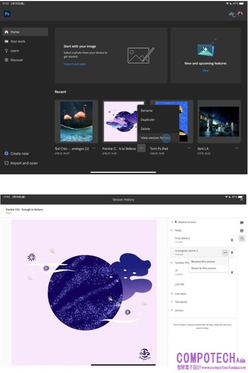 iPad 版 Photoshop的雲端文件版本歷史紀錄和離線使用雲端文件功能