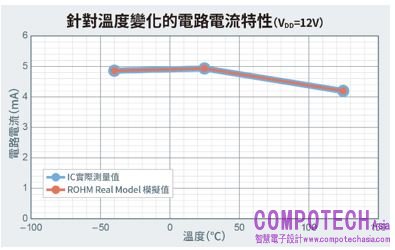 使用ROHM自有的建模技術,成功地使模擬值與實際IC值完全一致的高精度模擬模型。