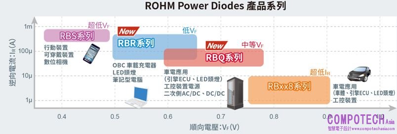 因此,ROHM不斷追求低VF特性和低IR特性之間的平衡,並進一步加強SBD小型化產品線,也成功以車電市場為主創造出非常優異的業績。本次ROHM針對已經具量產成果的RBR和RBQ系列,著力於大電流、高電壓和小型化,進一步擴大了產品線,可在更廣泛的應用中進行整流和保護的工作。