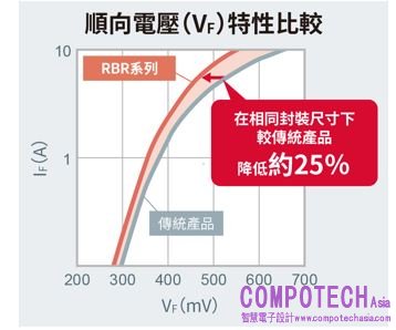 不僅如此,RBR系列具有出色的低VF(順向電壓)※2特性,不但是提高效率的關鍵,並且能確保低損耗。該系列產品非常適用於高效率應用,例如車電裝置中的車載充電器OBC,以及消費性電子的筆記型電腦等。本次又新增了12款小型封裝產品,有助進一步削減安裝面積(比傳統產品少42%)。