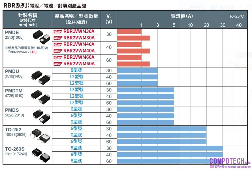 在RBR系列中,本次新增了12款 2.5mm×1.3mm的PMDE封裝產品(消費性電子和車電領域各6款)。目前該系列共有140款產品(耐壓:30V、40V、60V;電流:1A~40A),進一步擴大了在車電和消費性電子領域的應用範圍。