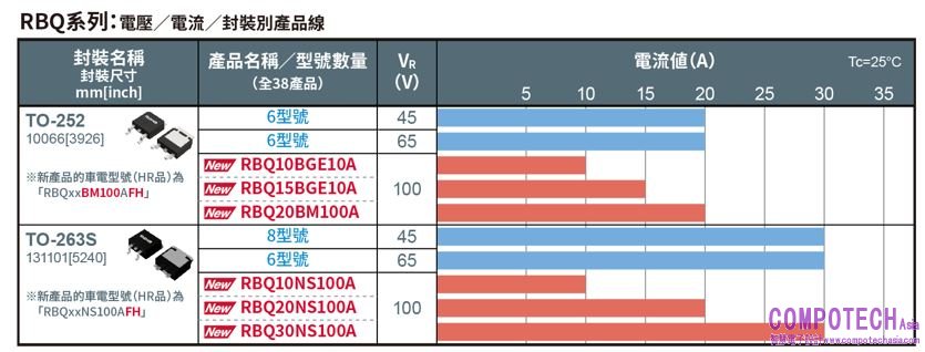 在RBQ系列中,本次新增了12款100V產品(消費性電子和車電領域各6款)。目前包括共陰極型和單晶片型產品在內,該系列已達38款產品(耐壓:45V、65V、100V;電流:10A~30A)。