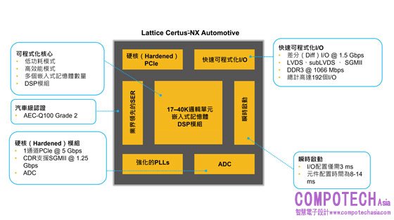2021年8月26日--萊迪思半導體公司(NASDAQ:LSCC)為低功耗可程式化設計元件的領先供應商,今日宣佈推出專為資訊娛樂系統、先進駕駛輔助系統(ADAS)以及安全應用優化的全新Certus™-NX FPGA系列的汽車級產品,繼續拓展其不斷完善的汽車產品系列。這些基於萊迪思NexusTM平台的全新Certus-NX元件不僅擁有汽車級功能,還有擁有同類產品最高的I/O密度、低功耗、高效能、小尺寸、高穩定性、瞬時啟動等特點,還支援高速PCI Express(PCIe)和超高速乙太網路(Gigabit Ethernet)介面。