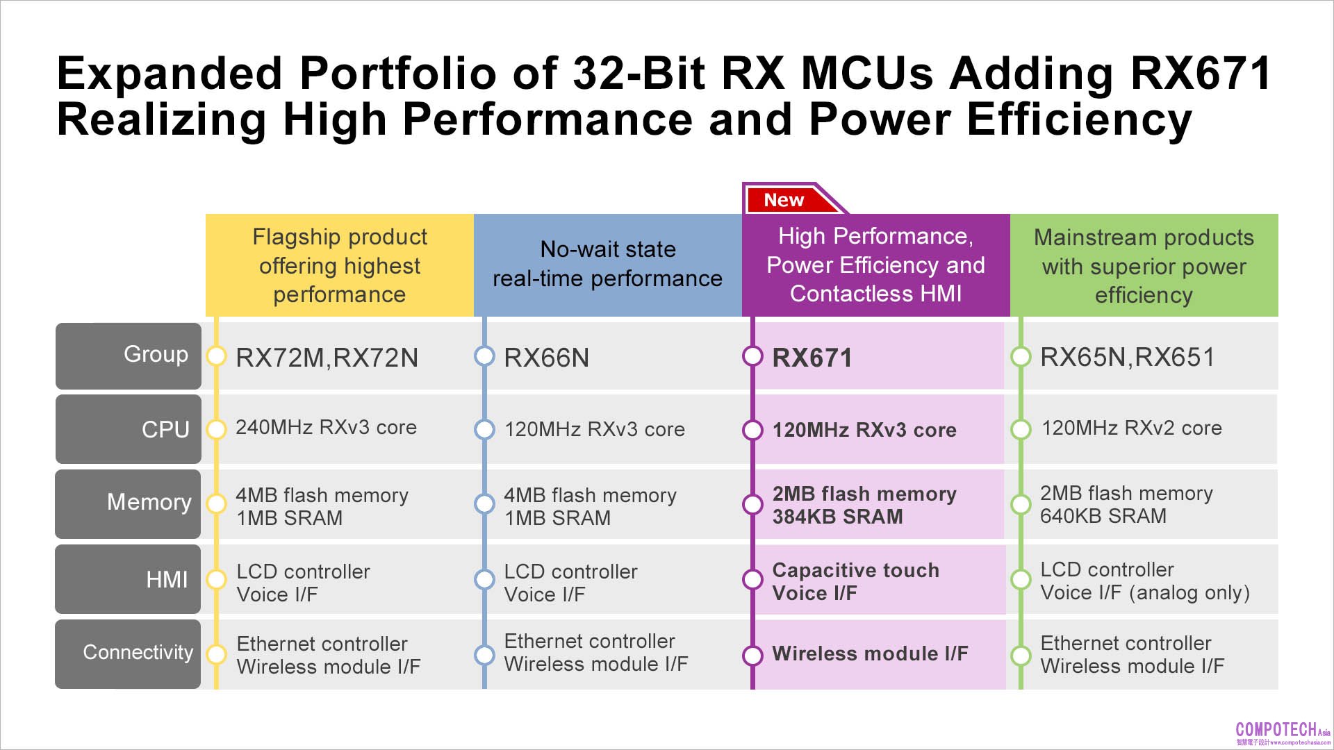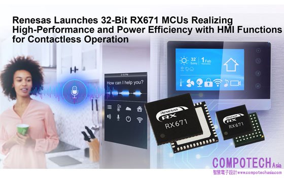 2021年9月8日--先進半導體解決方案頂尖供應商瑞薩電子(TSE:6723)今天推出32位元RX671微控制器(MCU)家族,在熱門的RX系列增加高效的觸控和語音辨識單晶片解決方案,以支援非接觸式操作。作為瑞薩主流RX600系列的一部分,RX671 MCU採用120 MHz的RXv3 CPU核心,並整合可在60 MHz運作的Flash,以提供出色的即時性能(CoreMark得分為707),以及業界最佳的48.8 CoreMark/mA功率效率。