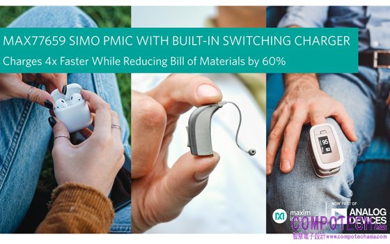 2021年9月22日--Analog Devices, Inc (Nasdaq: ADI) 宣佈推出MAX77659單電感多輸出(SIMO)電源管理IC (PMIC),整合開關模式升/降壓充電器,為可穿戴、耳戴式和物聯網(IoT)設備充電,比當前市場中的其他PMIC更快、體積更小。MAX77659 SIMO PMIC只需充電10分鐘即可提供超過4小時的續航時間,器件採用單電感為多個電源軌供電,將材料清單 (BOM) 減少60%,總方案尺寸減小50%。