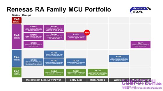 RA6E1 MCU包括六個不同的型號,從48接腳到100接腳封裝,512kB到1MB的Flash,以及256kB的SRAM。RA6E1具有卓越的功耗規格,及廣泛的周邊和通訊介面選項(包括乙太網),提供獨特的性能和功能組合。