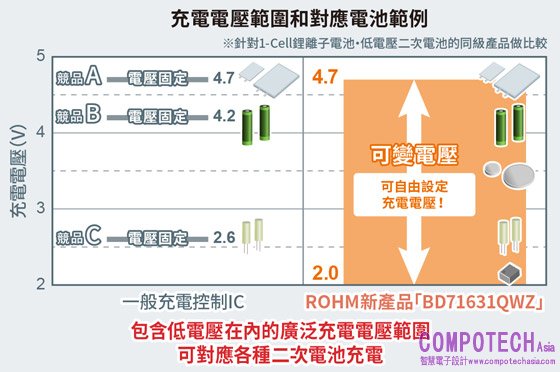 因此,ROHM推出一款全新充電控制IC,不僅支援鋰離子二次電池的充電,還支援全固態和半固態等新型二次電池的低電壓充電。