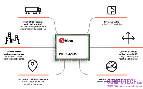 定位與無線通訊技術和服務的全球領導廠商u-blox (SIX:UBXN)宣布,推出 NEO-M9V 全球導航衛星系統 (GNSS) 接收器。NEO-M9V 是u-blox第一款同時提供無連線慣性導航(UDR, untethered dead reckoning)及汽車慣性導航(ADR, automotive dead reckoning)的定位接收器,非常適合即使穿梭在都市高樓大厦林立此類對 GNSS 信號極具挑戰性的環境中,依然需要可靠的公尺等級定位精準度的車隊管理和微移動應用。