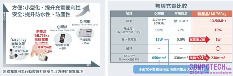 因此,ROHM集團旗下LAPIS Technology針對此課題,以13.56MHz為無線充電頻段,推出內建無線充電功能和非接觸式通訊功能、且充電量為200mW的無線充電晶片組「ML763x」,並已於2020年6月投入量產。該產品自上市以來,獲得用戶的高度好評,與此同時,客戶希望晶片組在應用於手腕式血壓計、智慧手錶和助聽器等,電池容量較大的穿戴式裝置時,能夠提高充電量。在上述背景下,LAPIS Technology又推出一款體積小巧、充電量高達1W的新產品,進一步擴大了可配備無線電源的應用範圍。