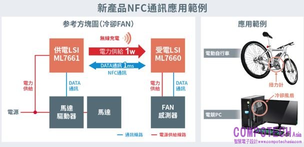 新產品的無線充電採用的是13.56MHz高頻段,所以也可以實現與同樣支援13.56MHz產品之間的非接觸式通訊—近距離無線通訊標準「Near Field Communication(NFC)」。由於兼具無線充電和非接觸式通訊兩種功能,因此在帶有旋轉機構(在有線充電系統中會限制設計靈活性)的裝置中,比如在工控裝置、電腦冷卻風扇、電動自行車扭力計*4等應用中,將有助提高產品的可設計性和設計靈活性。此外,透過LAPIS Technology獨家通訊格式,將資料通訊間隔由ML763x中的4ms縮短至ML766x中的1ms,確保了更即時的轉速控制和監測。