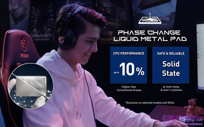 發表會中,MSI宣布專為Intel® Core™ i9處理器,推出全新獨家的「相變式液態金屬散熱技術」,相變式液態金屬散熱片於攝氏58度時,將由固態轉換為液態,填滿處理器晶圓頂部和散熱模組底部接觸的空隙,大幅提升熱傳導效率。相較於傳統散熱膏,相變式液態金屬散熱技術能更快速地將處理器工作熱量傳導至散熱模組,以達到最佳冷卻的效果。運用這項創新的散熱技術,能帶來處理器高達10%的整體效能提升!
