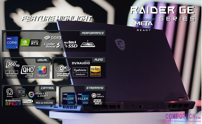 MSI筆電資深產品行銷陳昱廷(Eddie Chen):「當我們談到效能,Raider GE絕對是制霸電競領域的王者」。Raider GE系列維持指標性的全景炫光燈效,打造出迷人的科幻氛圍,效能表現更是令人驚艷。Raider GE 系列最高搭載第12代Intel ® Core™ i9系列處理器與NVIDIA® GeForce RTX™ 3080 Ti筆記型電腦GPU,更搭配了MSI獨家OverBoost技術,可提供CPU+GPU總功率高達220W的極致效能,對比市面上搭載RTX3080獨立顯示卡的筆電,能夠領先13%以上性能。