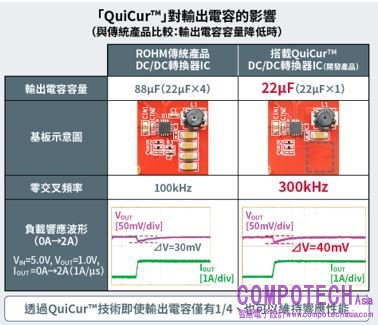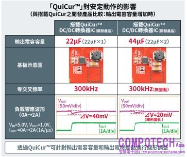 若在電源IC中採用此次新開發的高速負載響應技術「QuiCurTM」,將可以防止電源IC回授電路不穩定,並能確保所預期的響應性能。對於電源IC所需的輸出電容來說,不僅可以將電容量降至更低、減少元件數量和電路板安裝面積,還可對電容量和輸出電壓波動進行線性(常數為負比關係)調整,即使因規格變更導致電容量增加時,也可以輕鬆實現所預期的穩定工作,因此,從元件數量減少和運行更穩定兩方面來看,都非常有助減少電源電路設計工時。