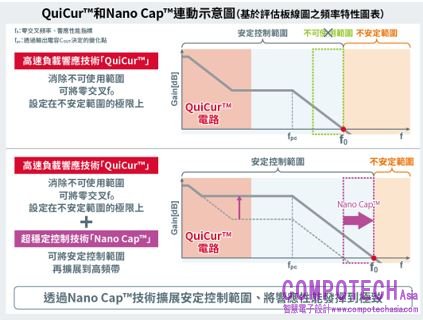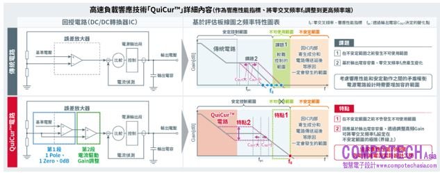 為了追求電源IC的響應性能極限,QuiCurTM技術精細劃分了響應速度(控制系統)和電壓穩定性(校準系統)的訊號處理任務,解決了傳統電源IC回授電路中存在的兩個問題:「在不安定範圍中的低頻段產生不可使用範圍」、 「零交叉頻率*2(f0)會隨輸出電容的容量而變化」。
