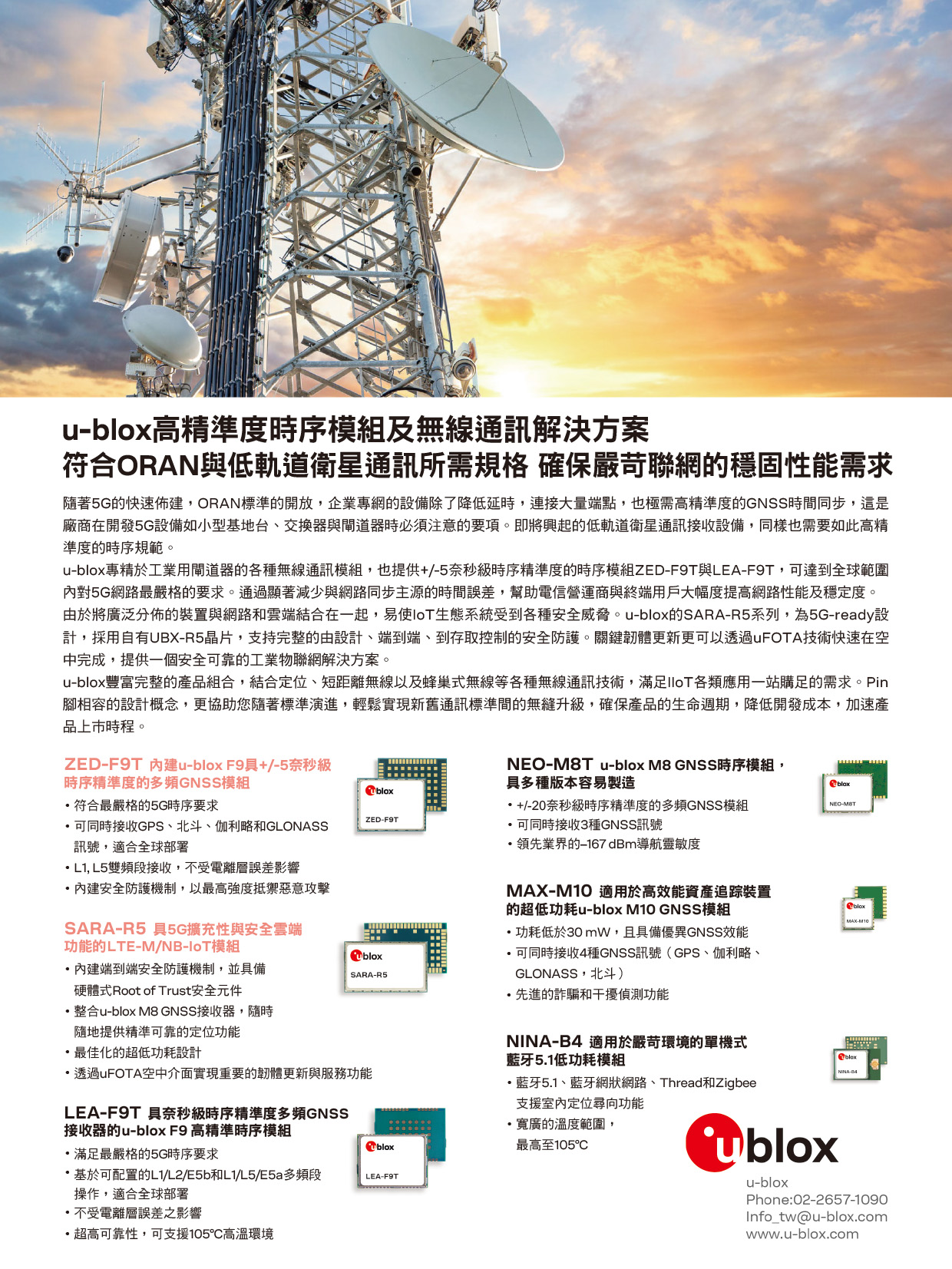 u-blox高精準度時序模組及無線通訊解決方案 符合ORAN與低軌道衛星通訊所需規格 確保嚴苛聯網的穩固性能需求
