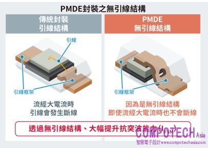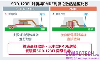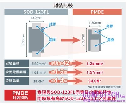 對此,PMDE封裝透過擴大背面電極面積,同時改善了散熱路徑,將經由引腳框架散熱改為直接散發到電路基板上。這使散熱性能大幅提升,以更小的尺寸(2.5mm×1.3mm)實現與普通SOD-123FL封裝(3.5mm×1.6mm)同級的電氣特性,可減少約42%的安裝面積,非常適合元件安裝密度不斷提高的車電應用。