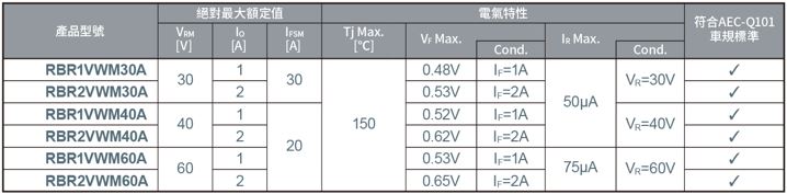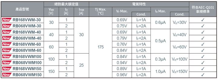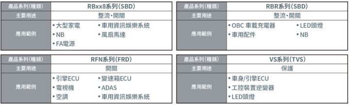RBR系列既確保了效率提升的關鍵要素—低VF特性,又保持了難以兼顧的低IR(逆向電流)特性,是在二個要素之間取得良好平衡的系列產品,已於2020年6月開始量產。該系列的產品系列中已有6款PMDE封裝的機型。