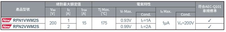 PMDE封裝用更小的尺寸實現了與SOD-123FL封裝同級電氣特性,並可確保優於SOD-123FL封裝的散熱性能和安裝可靠性。此外,支援車電應用的機型均符合汽車電子產品可靠性標準「AEC-Q101」*1。以下將介紹採用了PMDE封裝的特色產品系列。(SBD:僅RBR系列從2021年6月開始量產。)