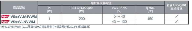 TVS是用來吸收引擎啟動或故障等情況下產生的突發電壓(突波*5)、並使其降至一定電壓的二極體。VS系列支援範圍達5V~130V的各種Stand-off voltage(VRWM)。(在5V~130V之間,分32階設定)