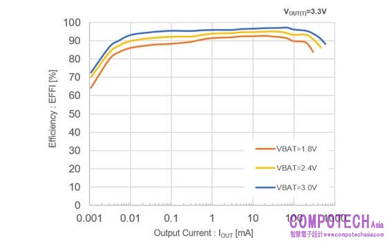 XC9145 系列的超低消耗電流電路將電流消耗降低至 400nA,同時採用 PWM/PFM 控制方式可顯著提高輕負載時的效率,特別是輸出電流為數μA 時,與傳統 DC/DC 轉換器相比,效率得到大幅提高(圖 1)。VIN = 2.4V,VOUT = 3.3V,IOUT = 10μA 時的效率達到89.9%,兼容低功耗的 MCU 和SoC。無需複雜控制,恆定升壓操作顯著降低 IoT 和便攜式設備等較大系統的待機功耗,有助於延長電池使用時間。