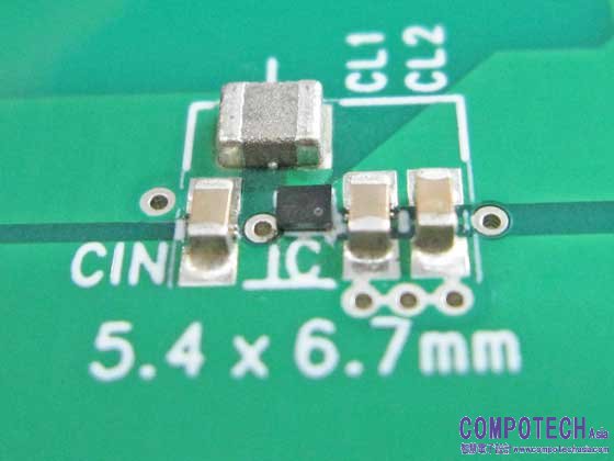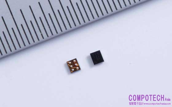 採用超小型封裝 WLP-6-05 (1.08 x 1.28 x 0.4 mm)(圖 2),即使在外部安裝小型線圈和陶瓷電容,也可實現 5.4 x 6.7 mm 的超小實裝面積(圖 3)。高待機效率可減小電池的尺寸和容量,有助於整個設備的小型化。