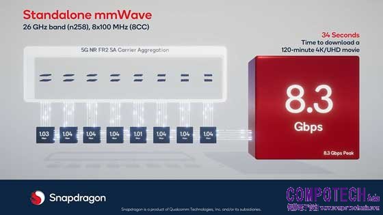 全球第一個5G獨立組網毫米波連線,尖峰速度超過 8 Gbps,搭載Snapdragon X70的測試5G裝置透過是德科技的5G協定研發工具套件,在高通技術公司位於聖地亞哥的5G整合與測試實驗室創下此一里程碑。5G獨立組網毫米波可以在無需使用6 GHz以下頻譜的錨點的情況下部署5G毫米波網路和裝置,使電信營運商能夠更有彈性地向住宅和商業客戶提供具有數千兆位元速度和超低延遲的無線光纖寬頻網路。透過此次產品展示,高通技術公司展現了其針對裝置和網路推動全新、世界級5G進展的承諾。