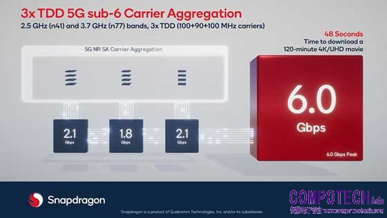 在高通5G高峰會上,高通還展示了Snapdragon X70的其他功能,例如AI增強的5G效能,以及跨三個TDD頻道的5G 6 GHz以下載波聚合——提供高達6 Gbps的尖峰下載速度。5G載波聚合可在具有挑戰性的環境下(例如遠離蜂巢式基地台的細胞邊緣)實現更高的平均速度和更強大的連線。